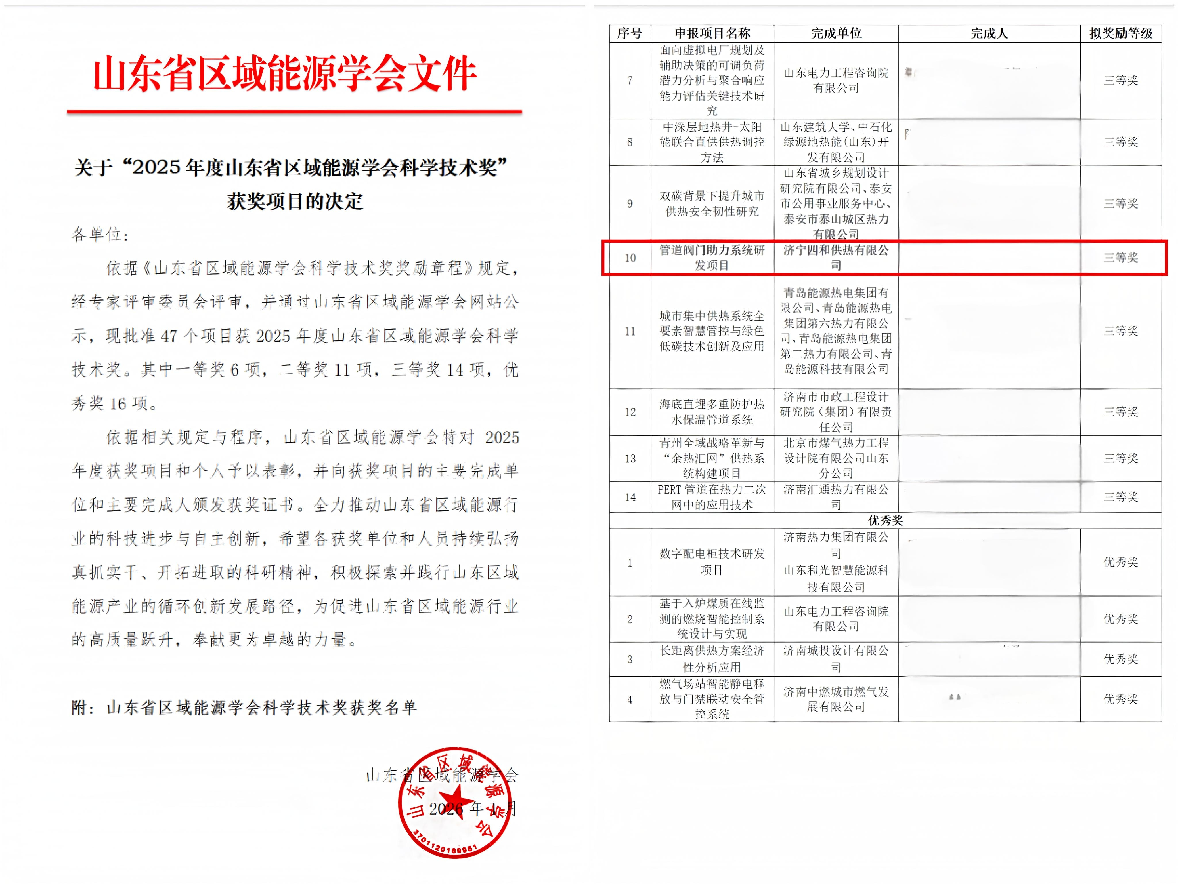 近日,2025年度山東省區(qū)域能源學會科學技術(shù)獎獲獎項目名單正式公示,濟寧四和供熱有限公司自主研發(fā)的管道閥門助力系統(tǒng)項目憑借突出的技術(shù)創(chuàng)新與應(yīng)用價值,成功獲得科學技術(shù)獎三等獎,這是對四和供熱公司技術(shù)研發(fā)實力和成果轉(zhuǎn)化能力的高度認可。